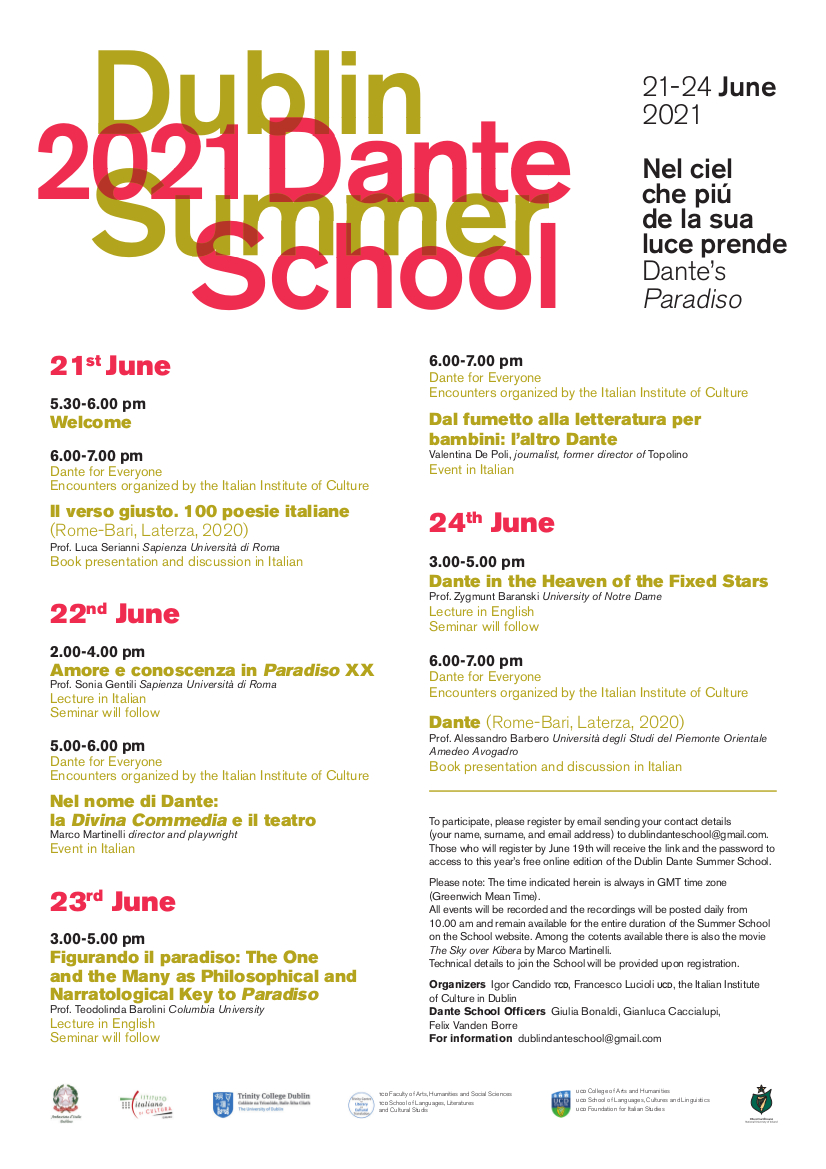 To participate, please register by email sending your contact details (your name, surname, and email address) to dublindanteschool@gmail.com. Those who will register by June 19th will receive the link and the password to access to this year’s free online edition of the Dublin Dante Summer School.