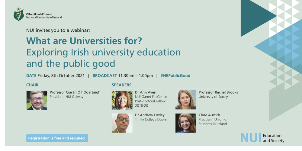 Please join us at 11.30am on Friday, 8 October 2021 for the next NUI Education and Society (online) seminar, What are Universities for? Exploring Irish university education and the public good.